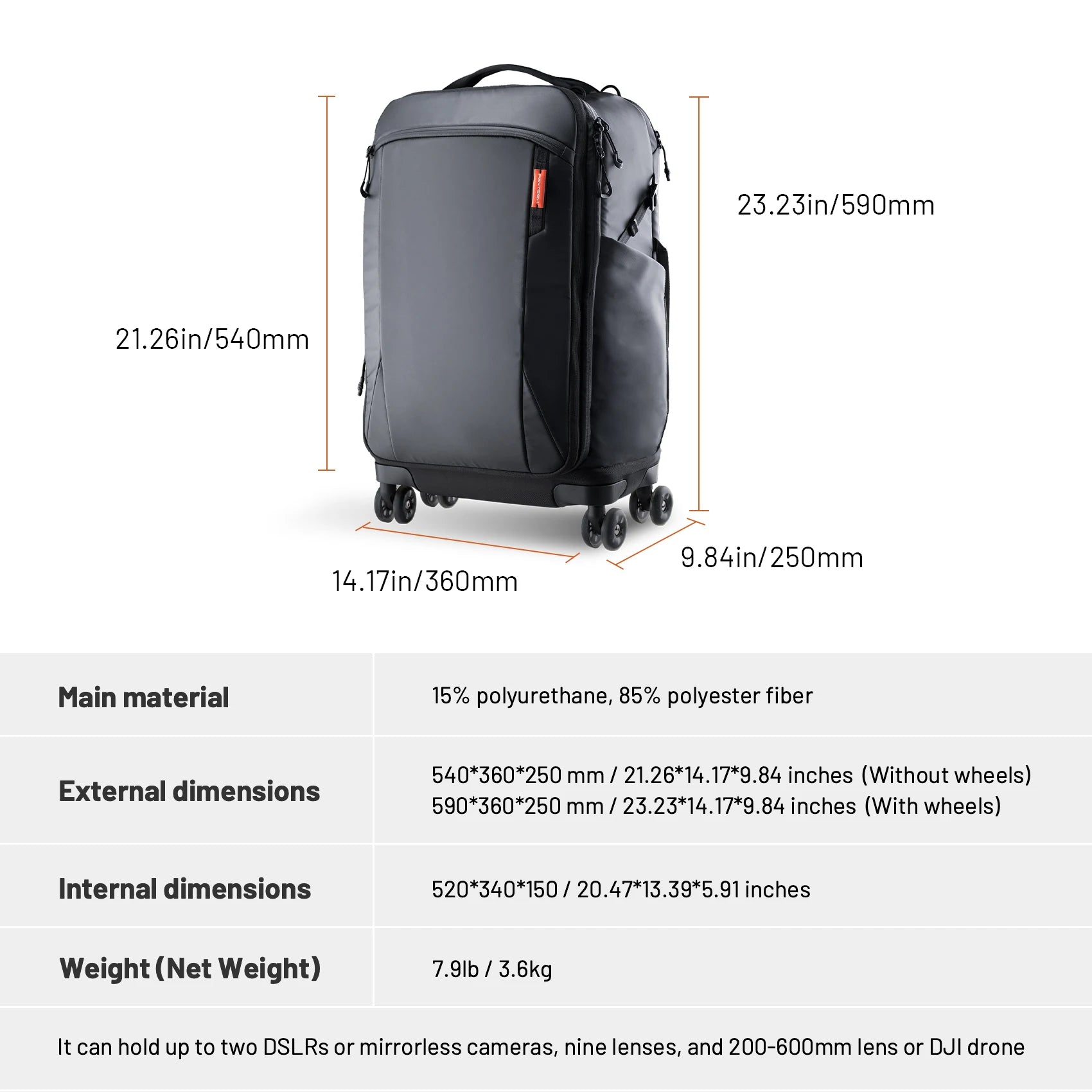 - Product external dimensions (including wheels): 590mm × 360mm × 250mm